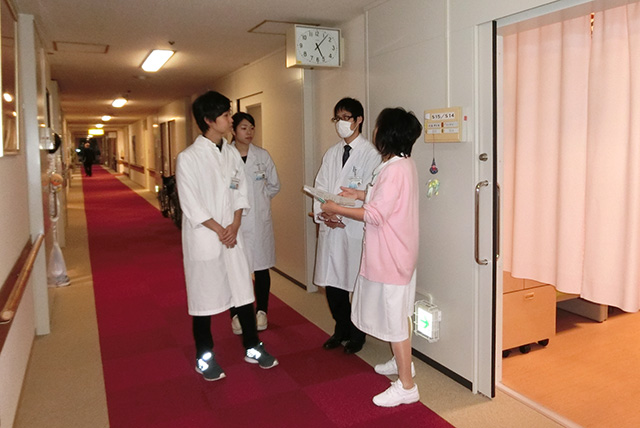 県養成医学生10名が参加し、3班に分かれ、院内を見学させて頂きました。今回は、緩和ケア病棟の患者様家族よりお話を聴くことができ、貴重な体験になりました。また、研修医の先生方よりお話しを伺い、交流を深めました。