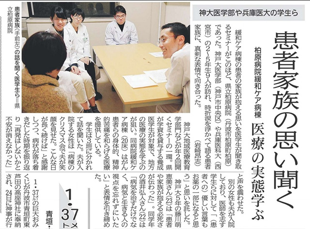 兵庫県立柏原病院主催県養成医学生10名が参加し、3班に分かれ、院内を見学させて頂きました。今回は、緩和ケア病棟の患者様家族よりお話を聴くことができ、貴重な体験になりました。また、研修医の先生方よりお話しを伺い、交流を深めました。