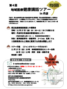 11月27 第4回地域医療健康講話ツアー 丹波市・県立柏原病院主催 丹波市立市島農村環境改善センター7:30~9:30 p.m.(うち発表15分) 医学部医学科・保健学科の学生4名が、「塩分摂取について」をテーマに、丹波市市島地区で約50名の住民を対象に健康講話を行いました。 チラシダウンロード PDFファイル(446KB)