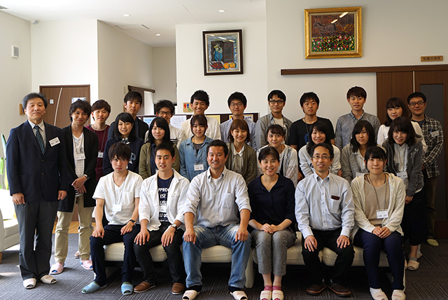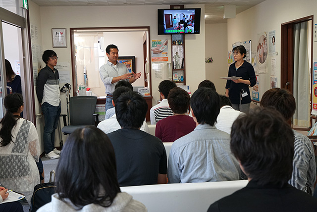訪問前日には、学生達は、2班に分かれて、「学びたいこと」をテーマにワークショップを行い、学習目標を明確し、情報を共有しました。当日には、施設の見学、岡本秀樹先生、岡本静子先生、黒瀬博計先生らから、地域医療のやり甲斐や楽しさ、地域医療・家庭医療にかかわる医師、理学療法士、看護師の役割等の講話を受け、その後、昼食を取りながら、交流を深めました。