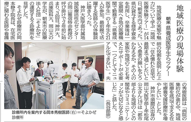 地域医療の楽しさ・おもしろさを知る地域医療体験ツアーを開催し、兵庫県養成医師OBで自治医科大学卒業医師が運営するそよかぜ診療所・はるかぜ診療所を訪問しました。神戸大学・兵庫医科大学・岡山大学から医学生・看護学生21名が参加しました。
