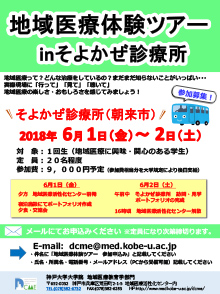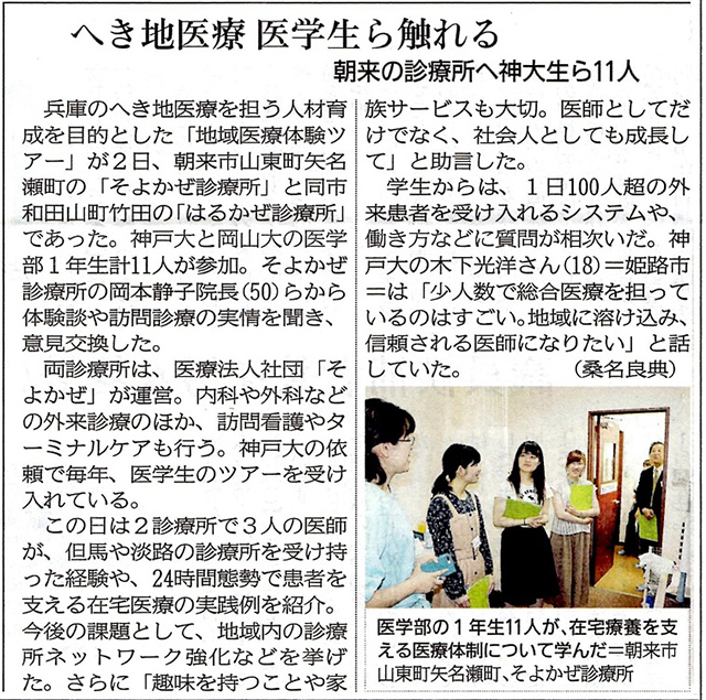 地域医療の現場で地域医療の楽しさ・おもしろさを体感する地域医療体験ツアーを開催しました。ツアーには、神戸大学・岡山大学からの医学科生計11名が参加し、兵庫県養成医師OBで自治医科大学卒業医師が運営するそよかぜ診療所・はるかぜ診療所を訪問しました。