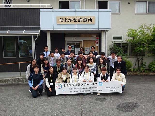 地域医療の現場で地域医療の楽しさ・おもしろさを体感する地域医療体験ツアーを開催しました。今年の初日は昨年同様にオンラインで開催しましたが、2日目は3年ぶりに現地へ訪問しました。ツアーには、神戸大学から医学科生と保健学科生、岡山大学・鳥取大学から医学科生のあわせて20人が参加し、兵庫県養成医師OBで自治医科大学卒業医師が運営するそよかぜ診療所・はるかぜ診療所を訪問しました。