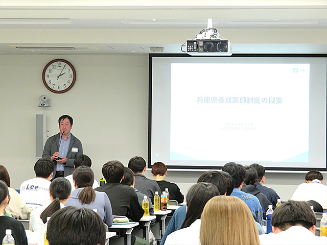 兵庫県医務課による「兵庫県養成医制度の概要」についての講演や、4年生による「地域枠医師・医学生としてのミッション遂行のために、体験したこと・学んだこと」をテーマにした発表が行われました。