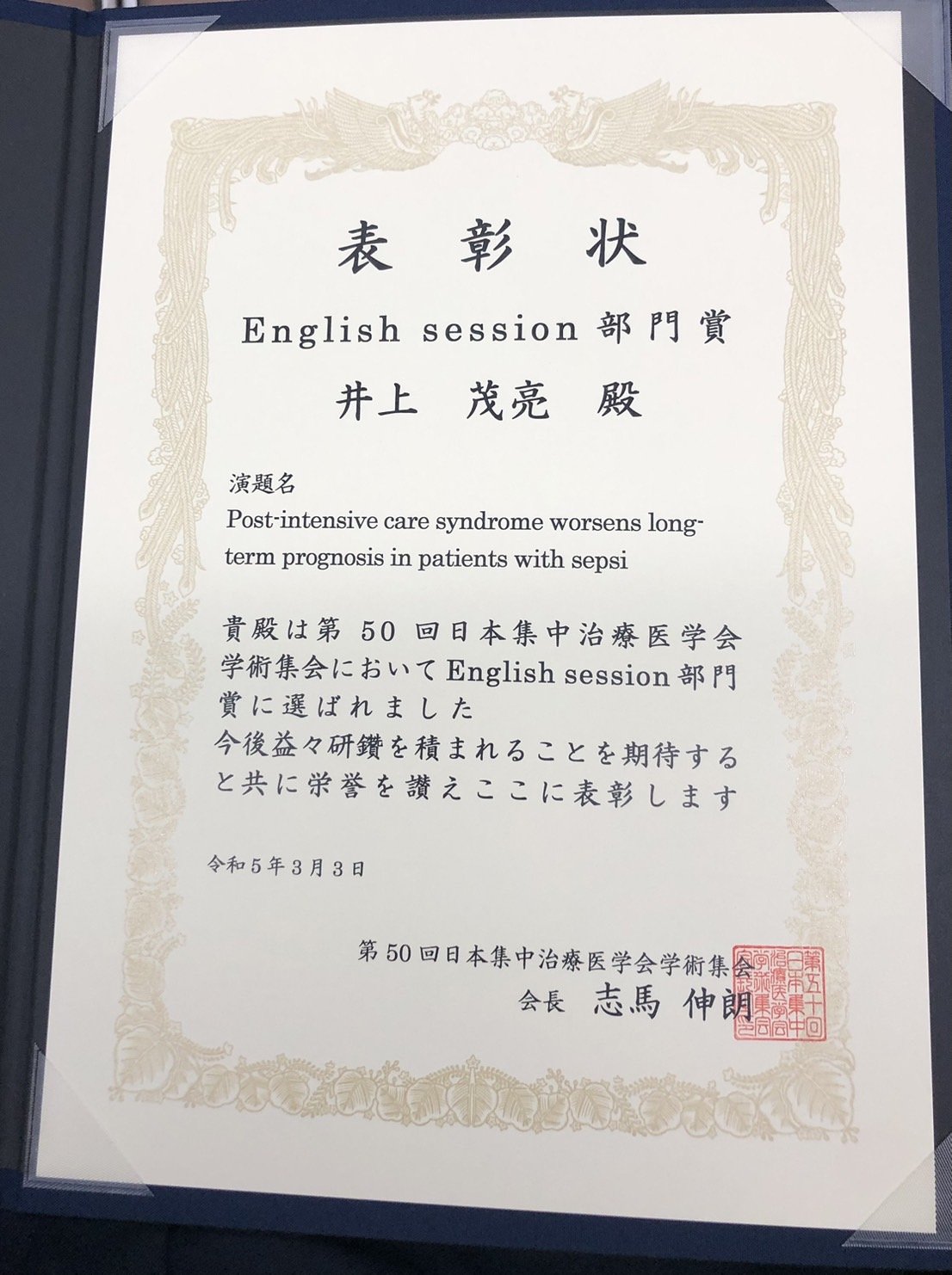 2023年3月2日、国立京都国際会館で開催された第50回日本集中治療医学会学術集会で、 当科の井上 茂亮先生がEnglish session部門賞を受賞しました。受賞演題は"Post-intensive care syndrome worsens long-term prognosis in patients with sepsis"です。 同賞は、同学会English sessionで発表された優秀な演題に授与されるものです。受賞誠におめでとうございます。