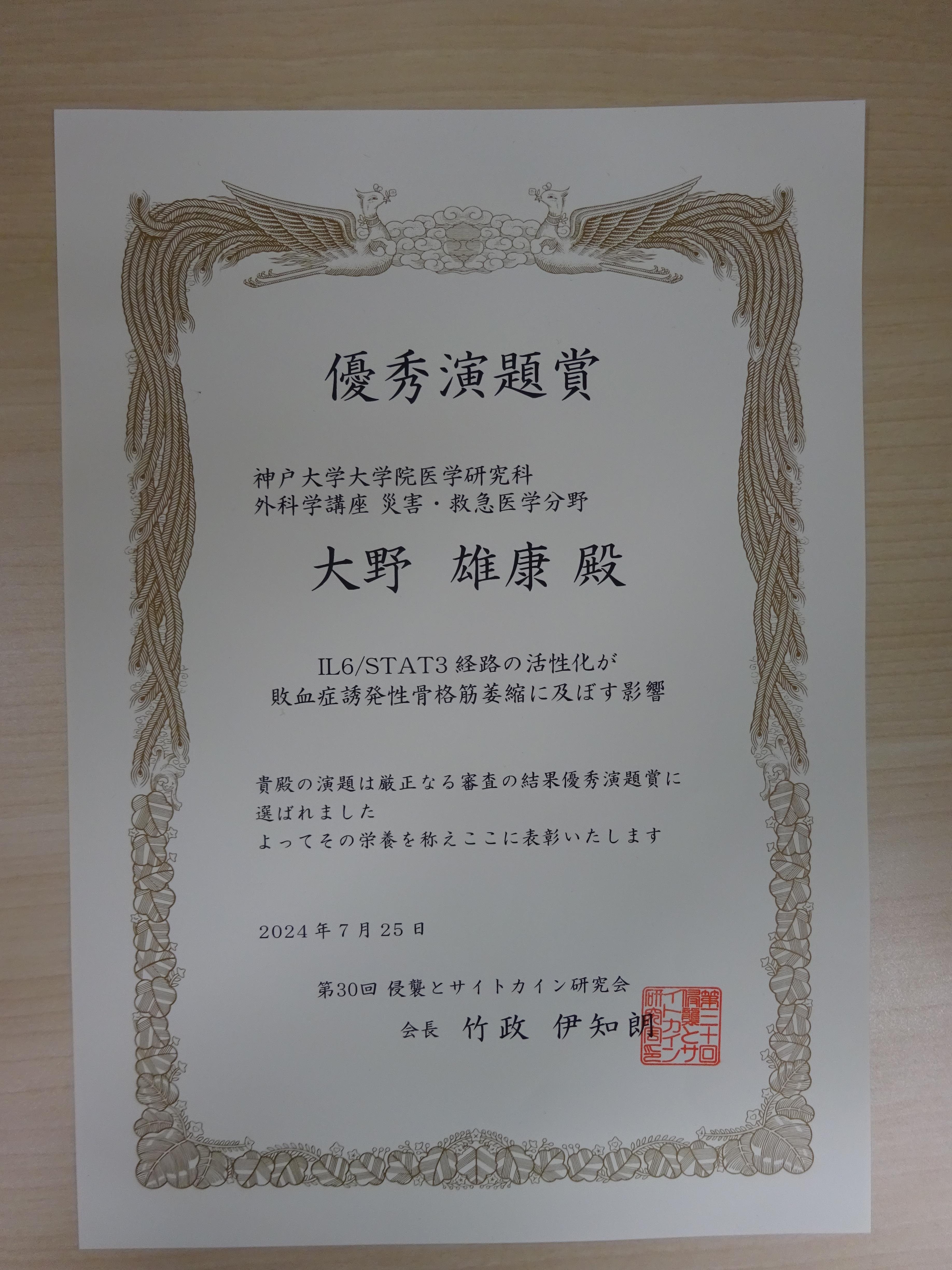 2025年7月3日、東京で開催された第31回侵襲とサイトカイン研究会において、当科の中村 謙介先生が優秀演題賞を受賞しました。受賞演題は「重症COVID-19におけるトシリズマブのIL-6阻害と身体予...