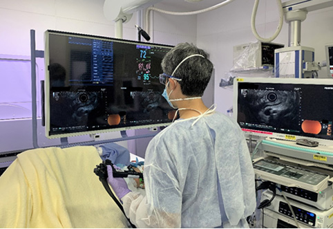 胃や十二指腸の壁を介して膵臓の近くから見ることができるため、おなかの表面から超音波をあてる腹部エコー検査よりも腸管ガスや内臓脂肪の影響を受けにくいのが最大のメリットであり、早期膵癌の診断のために不可欠な検査法です。