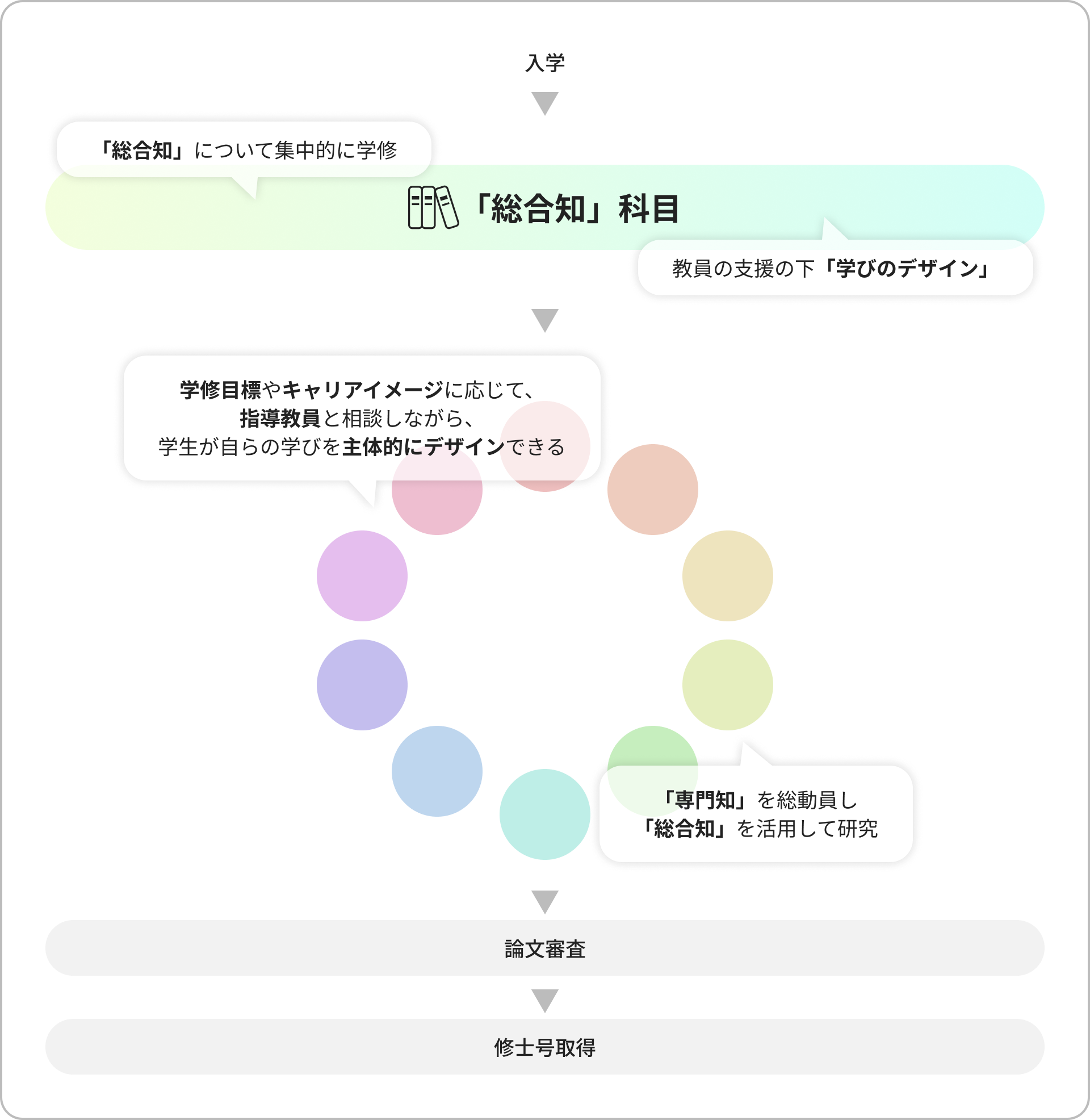 先進生命医科学系専攻は、この「総合知」の推進に向けて、総合知の源泉となる「知」そのもの、つまり生命医学系の専門知を持つ学生が集い、専門知を深めるとともに、総合知を実践するための方法論を修得するための場となります。