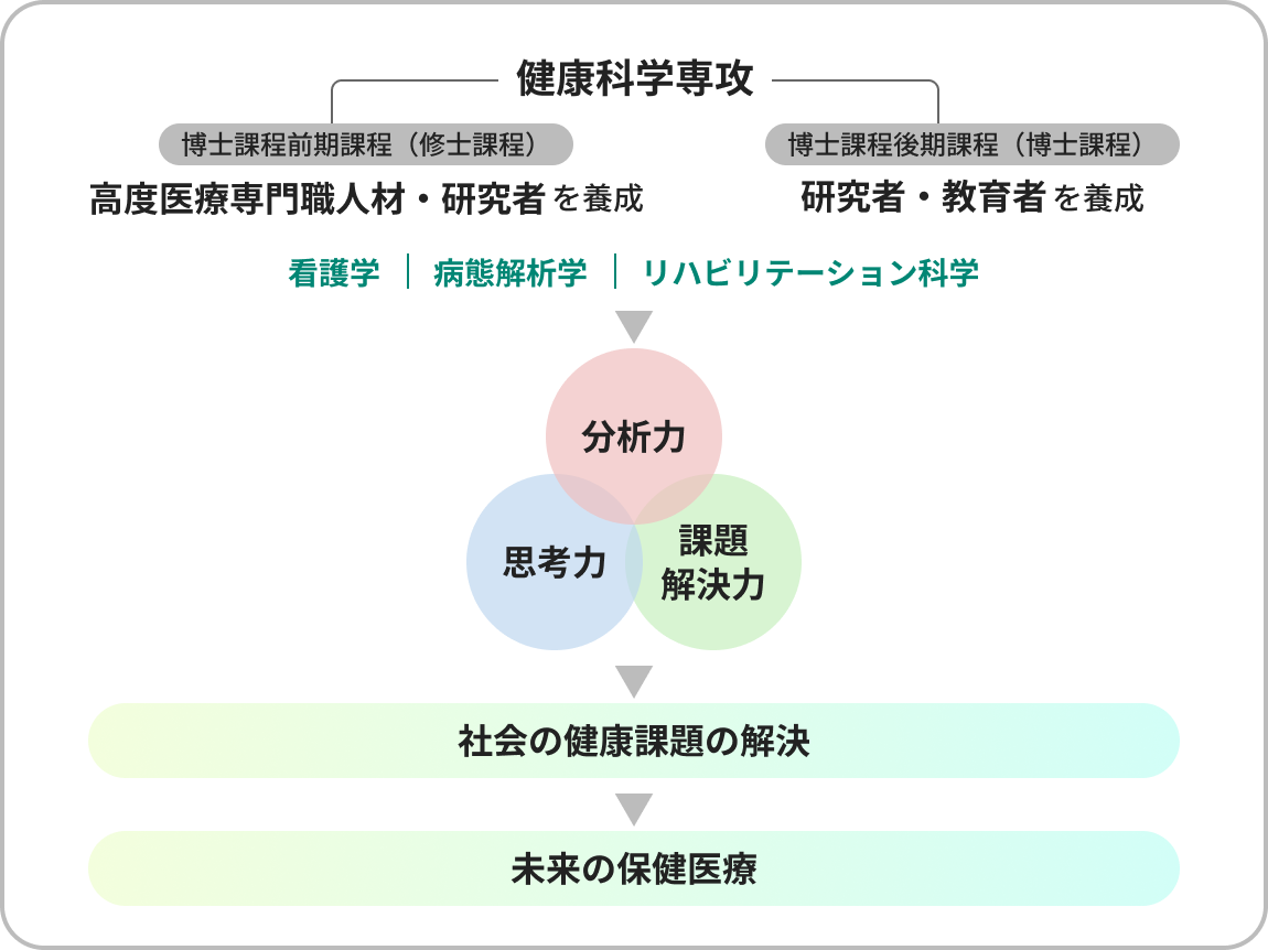 本専攻は、健康科学に関する教育と研究を通して、人々の健康の維持・増進および疾病や障害に関する理解を深め、保健医療の発展と社会福祉の向上に寄与することを目的としています。多様化・高度化する健康課題に対応するため、生命の尊厳と高い倫理観を基盤に、専門知と総合知を結合させながら、科学的根拠に基づく分析力、論理的思考力、課題解決能力を養成します。また、地域社会および国際社会の保健医療に関する課題に主体的に取り組み、専門職として指導的役割を担う人材の育成を目指します。
