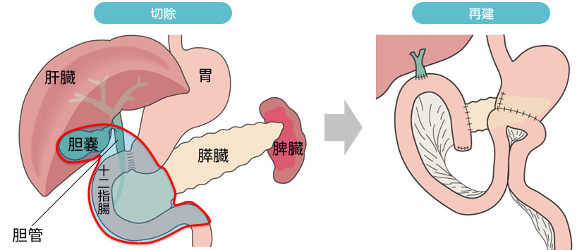 膵頭部の病変や胆管や十二指腸癌の一部に対する標準術式です。膵頭部は十二指腸、胆管、胆嚢とつながっているため、それらも同時に切除する必要があります。切除後は再建が必要であり、膵臓と小腸(膵空腸吻合)、胆管と小腸(胆管空腸吻合)、胃と小腸(胃空腸吻合)を行います。開腹で行う場合と、腹腔鏡やロボット支援下(da Vinci)で行う場合があります。