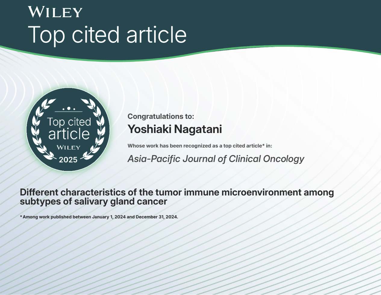 当科特定助教の長谷先生の論文がAsia-Pacific Journal of Clinical Oncologyの『Top cited article』に選ばれました