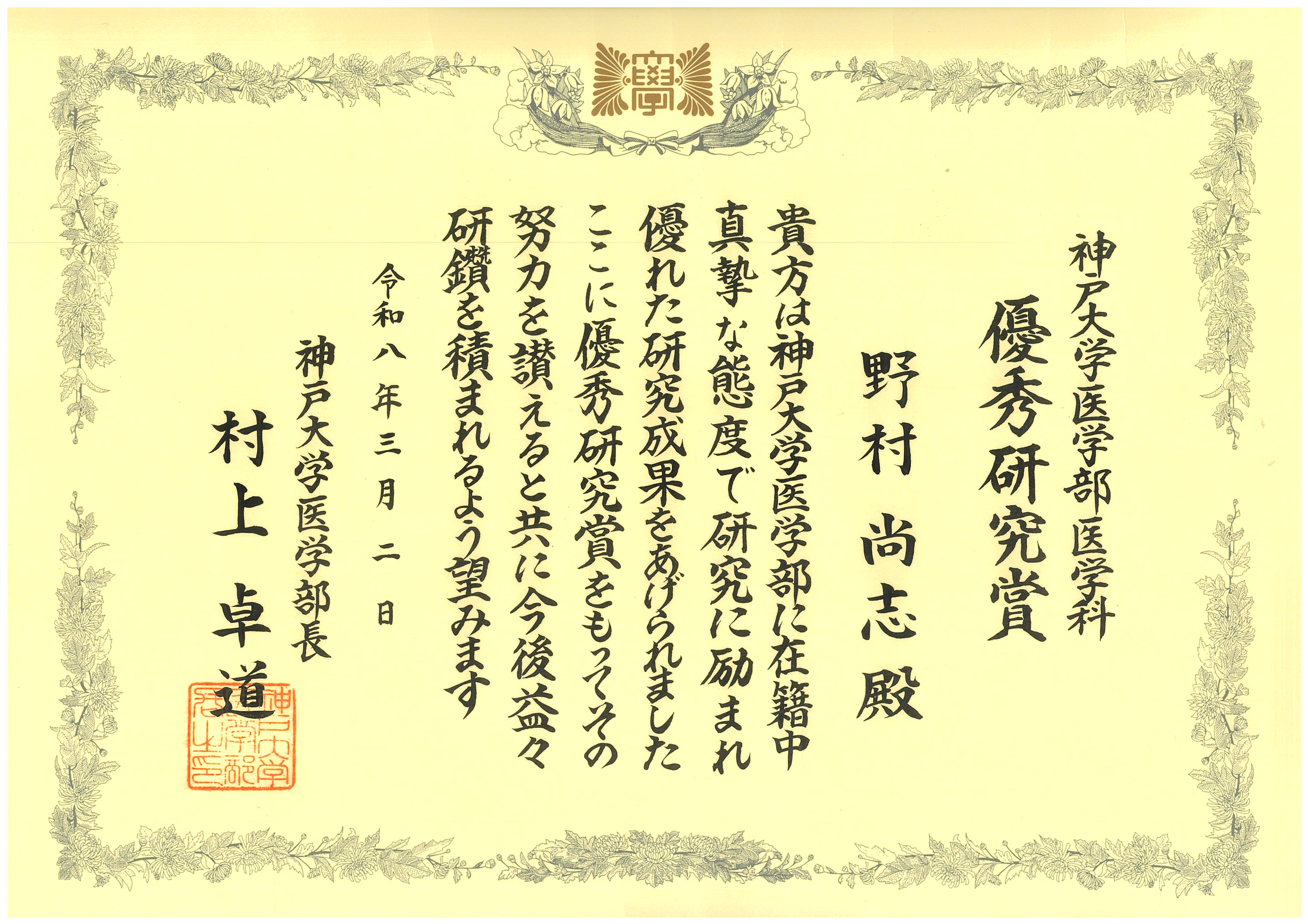 大学院生の佐藤 経雄さんが令和3年度神戸大学医学部基礎・臨床融合による基礎医学研究医の養成プログラム研修会において優秀賞を受賞しました。